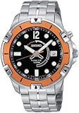 The kinetic-powered Seiko Men's USA Sport 100 Kinetic Watch includes an attractive orange bezel and contrasting large white hour indexes that give this sporty timepiece eye-catching appeal. Constructed with a stainless steel case, the watch includes a stationary stainless steel bezel and a stainless steel link bracelet with a push-button-deployment clasp. A durable hardlex window shields the black dial face, which features white-dot-and-dash hour indexes, along with an Arabic numeral hour marker at 12 o'clock. Discrete Arabic numeral seconds markers ring the dial, which also includes a convenient date calendar at three o'clock. This watch is water resistant to 330 feet. It is presented in a luxuriously padded Seiko case. Kinetic: A powerhouse in technological innovationLike mechanical and quartz, Kinetic is a platform. Over the past 20 years, SEIKO has created on this platform a suite of Kinetic movements, each bringing unique features to the consumer.It was at the 1986 Basel Fair that SEIKO unveiled its first Kinetic prototype. Introduced under the trial name of 'AGM', it was the first watch in the world to convert kinetic movement into electrical energy. It was the first step in a development that, 20 years later, has made Kinetic synonymous with environmental friendliness, high performance and long-lasting convenience to a generation of users worldwide. From the launch in 1988 of the first commercially available watch (then under the new name AGS) until today, over eight million Kinetic watches have been sold (as of 2007).In 1998, Kinetic Auto Relay was released, extending the 'at-rest' operating period of the watch to a remarkable 4 years. 1999 saw the launch of the Ultimate Kinetic Chronograph, a masterpiece which fused the very best of SEIKO's mechanical and electronic watch making skills, and in 2003 another Kinetic Chronograph was launched. At Baselworld 2005, the Kinetic Perpetual made its first appearance, combining Kinetic convenience and longevity with a perpetual calendar, correct to the year 2100. In 2007, SEIKO's emotional technology Kinetic Direct Drive is introduced.