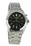 Price : $270.00 Wearing this watch generates the electricity to power the watch through a stored energy capacitor. This watch features a charcoal dial LumiBrite hour and minute hands, second hand and date indicator. The dial measures approximately 1 3/16 inches in diameter and includes 22K yellow gold over stainless steel accents. The stainless steel case features a see-thru case back. This watch includes a power reserve indicator function, 6-month capacitor, cabochon crown and Sapphire crystal. The bracelet measures approximately 8 1/4 inches in length, 3/4 inch in width and features a deployment clasp. Our bracelet is styled in brushed stainless steel and 22K yellow gold over stainless accents. This watch is water resistant up to 100 meters and is back by Seiko's 3-year limited warranty.