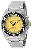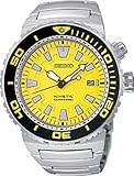 Sophisticated design takes on a bold athletic face in the Seiko Men's Divers Watch #SKA367. Showcasing a stainless steel unidirectional bezel featuring a black finish with silver-tone Arabic numeral indices and textured edges, along with a vibrant yellow dial with round, lumibrite indices, and skeleton hands with lumibrite pointers, this kinetic watch features an automatic power generator. Also offering a stainless steel bracelet band held in place by a fold-over clasp with double-push-button safety, a screw-down crown and caseback, and a durable hardlex crystal, this timepiece is water resistant to 660 feet and is backed by a three-year manufacturer warranty.Kinetic: A powerhouse in technological innovationLike mechanical and quartz, Kinetic is a platform. Over the past 20 years, SEIKO has created on this platform a suite of Kinetic movements, each bringing unique features to the consumer.It was at the 1986 Basel Fair that SEIKO unveiled its first Kinetic prototype. Introduced under the trial name of 'AGM', it was the first watch in the world to convert kinetic movement into electrical energy. It was the first step in a development that, 20 years later, has made Kinetic synonymous with environmental friendliness, high performance and long-lasting convenience to a generation of users worldwide. From the launch in 1988 of the first commercially available watch (then under the new name AGS) until today, over eight million Kinetic watches have been sold (as of 2007).In 1998, Kinetic Auto Relay was released, extending the 'at-rest' operating period of the watch to a remarkable 4 years. 1999 saw the launch of the Ultimate Kinetic Chronograph, a masterpiece which fused the very best of SEIKO's mechanical and electronic watch making skills, and in 2003 another Kinetic Chronograph was launched. At Baselworld 2005, the Kinetic Perpetual made its first appearance, combining Kinetic convenience and longevity with a perpetual calendar, correct to the year 2100. In 2007, SEIKO's emotional technology Kinetic Direct Drive is introduced.