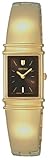 Price : N/A . . . . Polished Gold-Tone stainless steel case and bracelet . . Chocolate dial with gold tone hands and markers . . Hardlex mineral glass crystal . . Water resistant to 30 meters (100 Feet) . . Bangle style bracelet features a Jeweler's style clasp . . 15.2mm Case Width (Approximately 5/8") . .